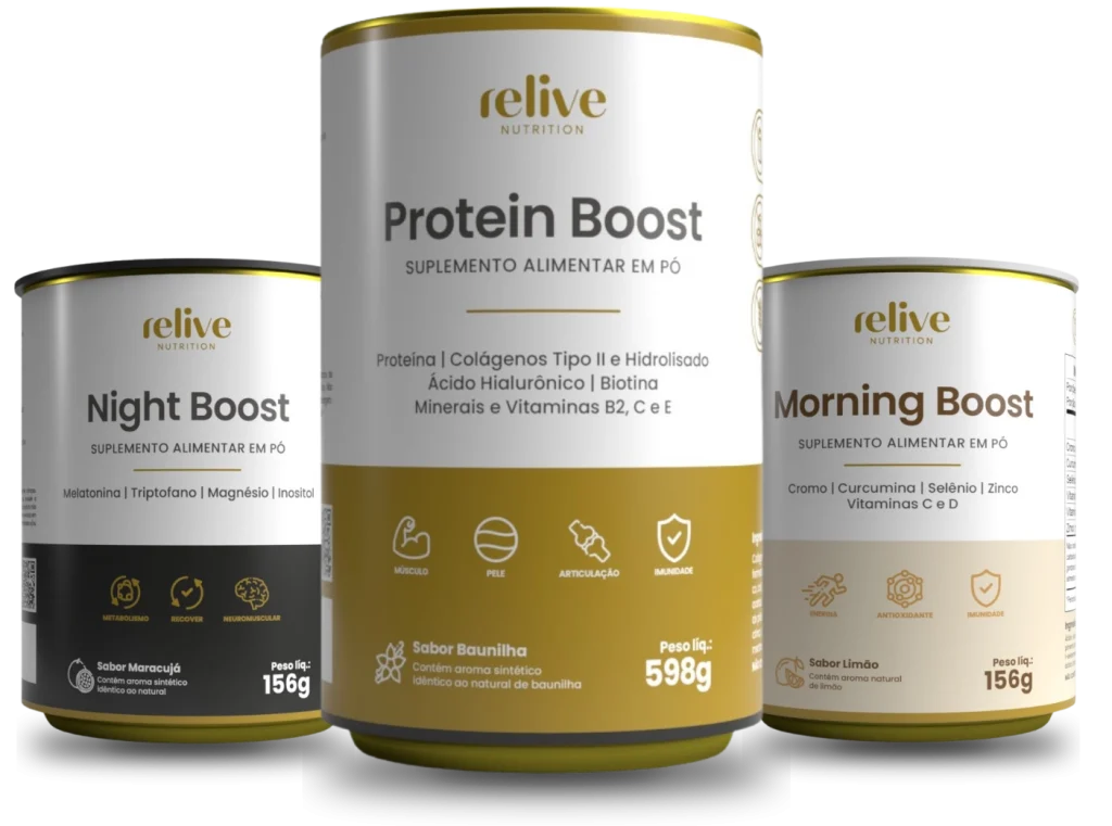 Relive Nutrition é um kit completo de suplementos alimentares desenvolvido para promover saúde, bem-estar e beleza em todos os momentos do dia. Ele inclui três produtos: Morning Boost, Night Boost e Protein Boost, cada um com uma fórmula exclusiva para atender às necessidades do seu corpo em diferentes momentos.